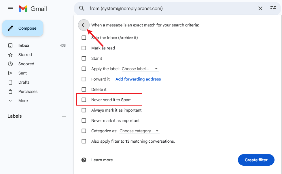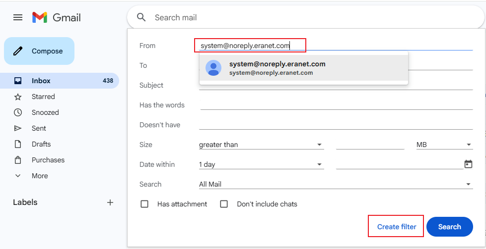 Step 2: In the sender field of the search criteria window, enter system@noreply.eranet.com, and then click “Create filter” in the lower right corner of the search window.