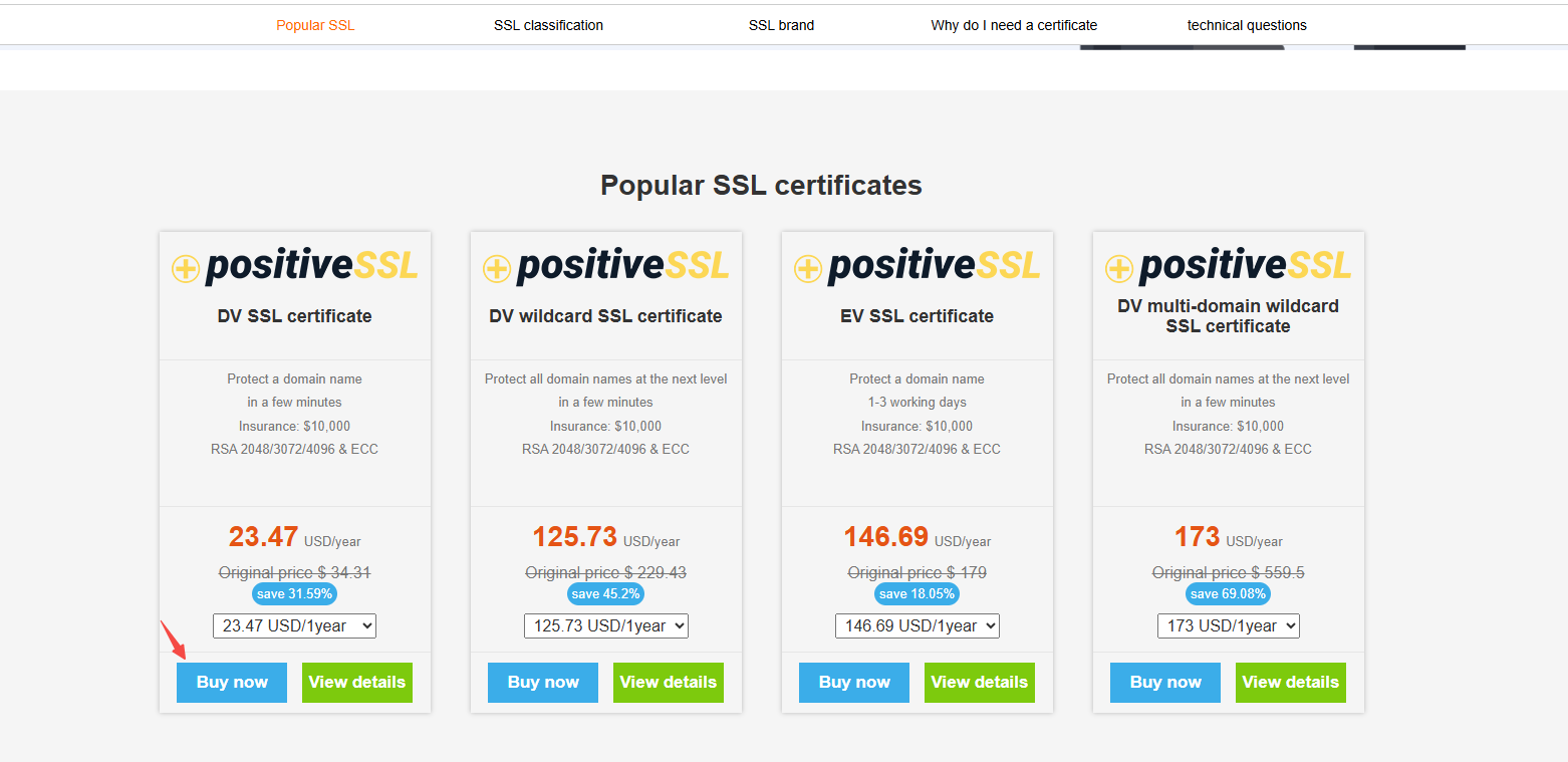 **Click to go to the certificate purchase page Click to Purchase (Taking PositiveSSL certificate as an example). **