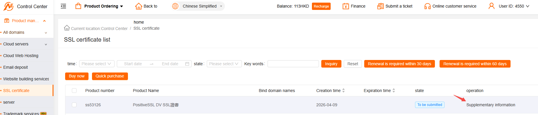 After successful purchase, you will be redirected to Control Center -> Product Management -> SSL Certificate