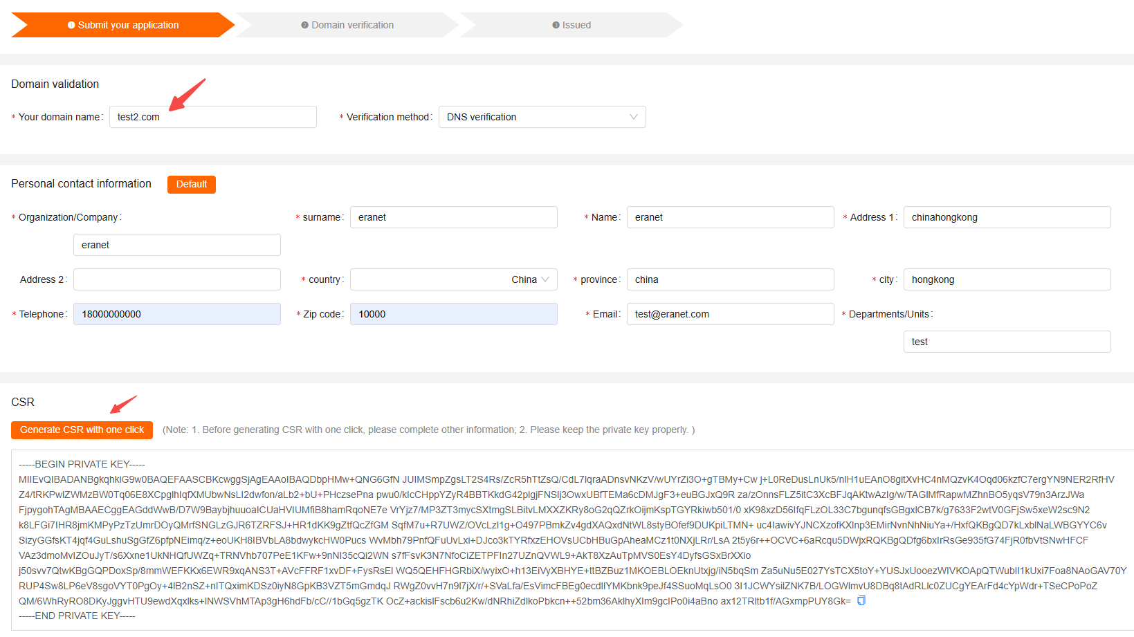Fill in the basic certificate information according to the prompts, including the domain name and verification method. This tutorial uses DNS verification as an example; file verification is optional. Then click Submit